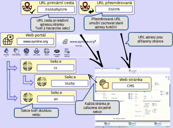 Webový portál může být členěn na sekce a ty dále na podsekce. Příkladem je adresa (https://www.pdqm.cz/sluzby/projekty/sluzby). V rámci této adresy je sekce služby. Sekce se mohou dále členit.